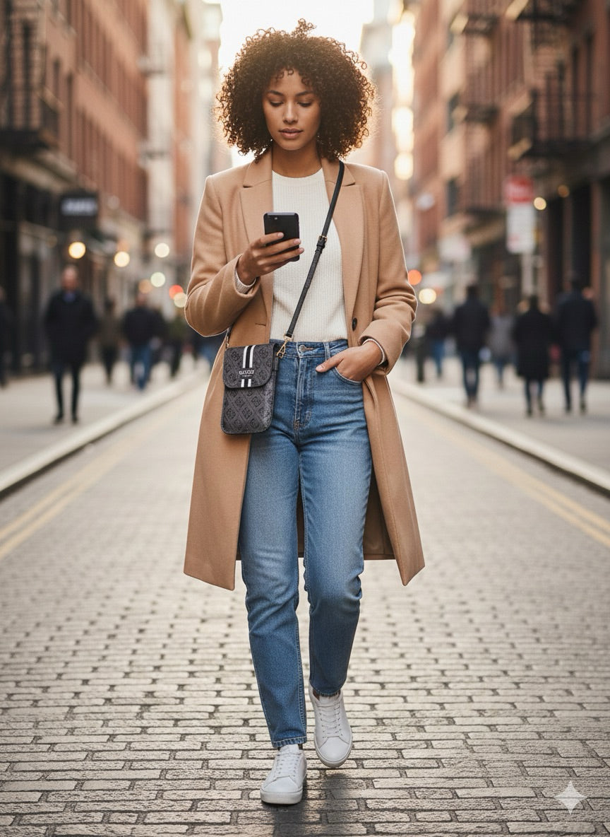 Este Guess Universal Phone Bag en negro monogram 4G fue creado para mujeres que buscan equilibrio: practicidad absoluta, estética moderna y la tranquilidad de llevar su celular y esenciales siempre protegidos.